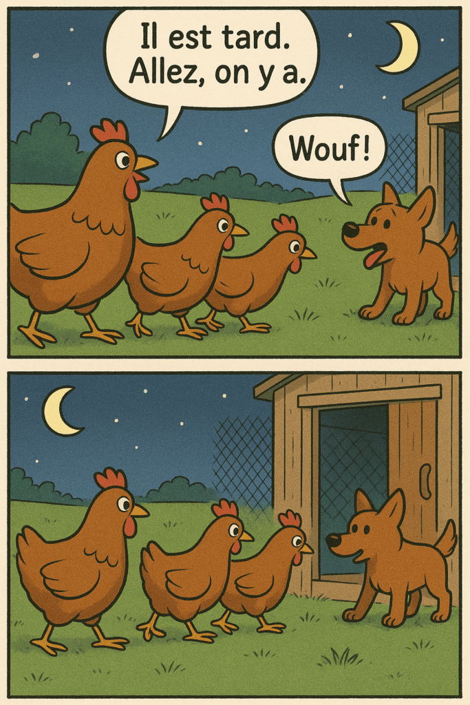 • Chien : “Allez les filles, il est l’heure de rentrer au bercail !”