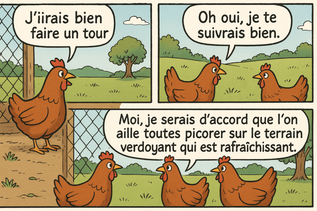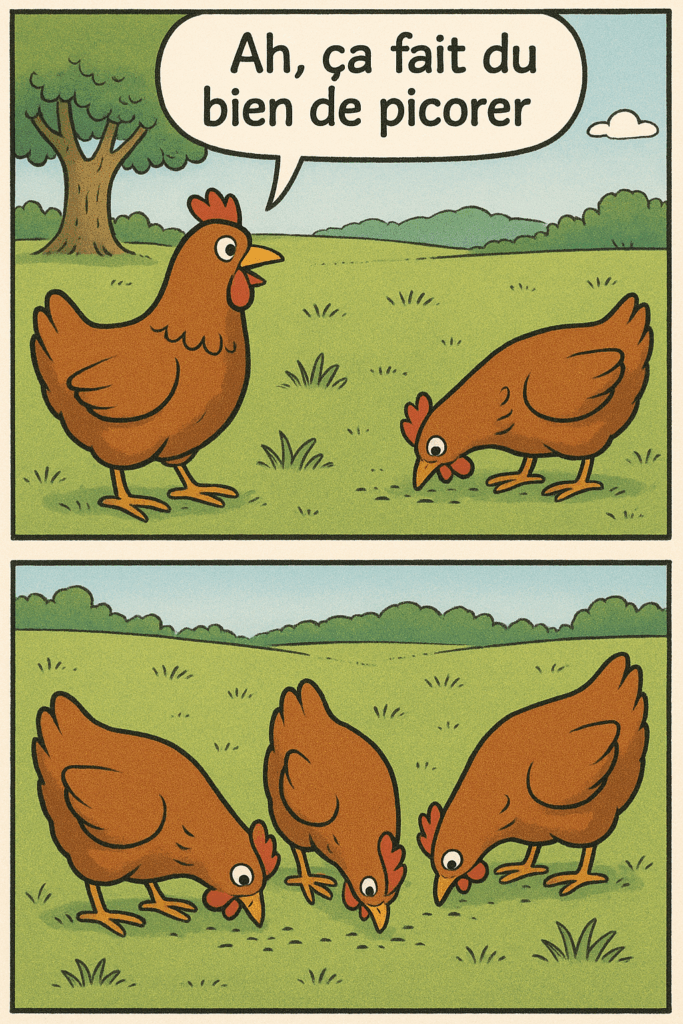 • Poule 1 : “Ah, ça fait du bien de picorer ici !”