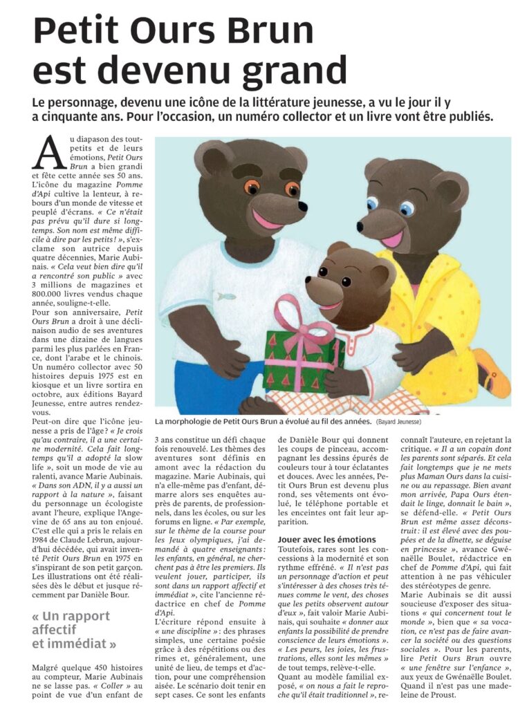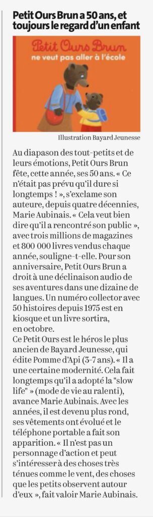 Petit Ours Brun est bien connu des petits avec ses livres et magazines. Il est né en 1975. L’auteure est Marie Aubinais, qui s’étonne de sa durée.