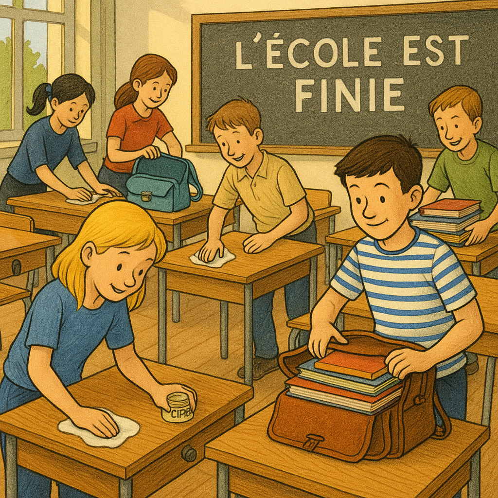 La cloche a sonné une dernière fois. Dans la classe baignée de soleil, les élèves s’activent joyeusement : certains rangent leurs cahiers dans leur cartable, d’autres frottent leur bureau avec soin, une boîte de cire ouverte à portée de main. Sur le tableau, en grandes lettres blanches, on lit : « L’ÉCOLE EST FINIE ». Les sourires sont partout. Une douce excitation flotte dans l’air — les grandes vacances commencent enfin.