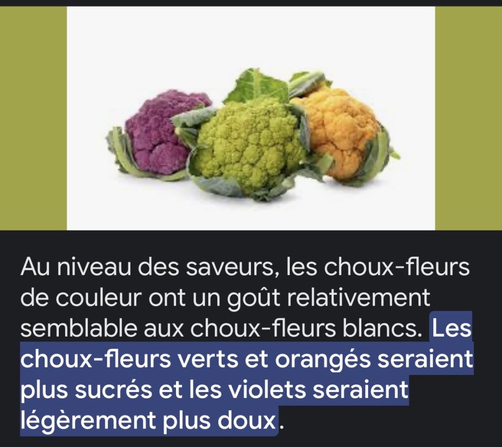 Première fois que je vois un chou fleur de cette couleur. Le plus commun est le blanc.