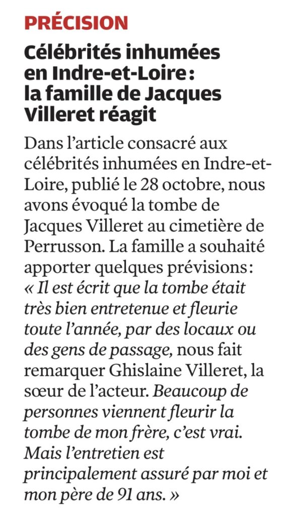 Ghislaine Villeret, la sœur de l’acteur Jacques Villeret, intervient au sujet de l’article paru le 28 octobre dans la nouvelle République 37. Ce n’est pas ce qui est mentionné du tout.