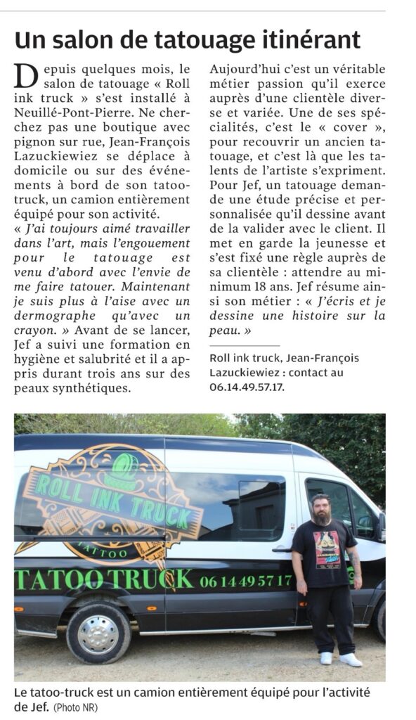 Depuis quelques mois, un tatoueur s’est installé à Neuillé Pont Pierre, pas dans un magasin comme on pourrait le penser, mais dans un véhicule aménagé pour la cause. Il se déplace selon les demandes à notre domicile ou pour certaines occasions.