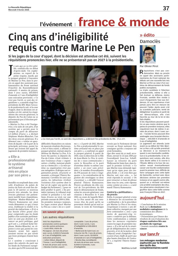 Dans son édition du mercredi 4 février 2026, La Nouvelle République consacre un article majeur à la procédure judiciaire visant Marine Le Pen. Le quotidien revient sur les réquisitions prononcées en appel par le parquet général dans l’affaire des assistants parlementaires européens du Front national, devenu Rassemblement national.
